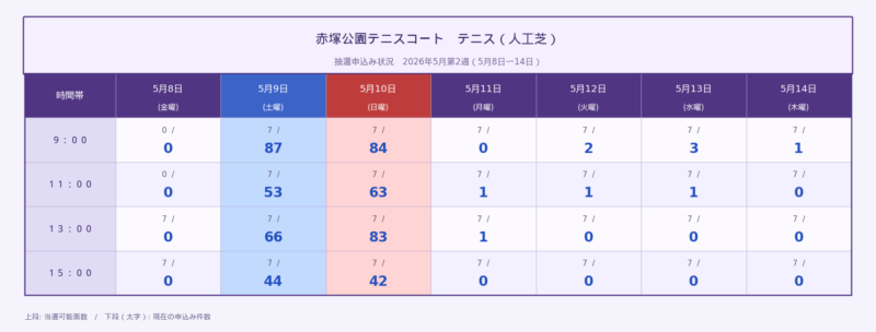 • 東白鬚公園:平日は全曜日・全時間帯で申し込みゼロ。平日ならほぼ確実に当選